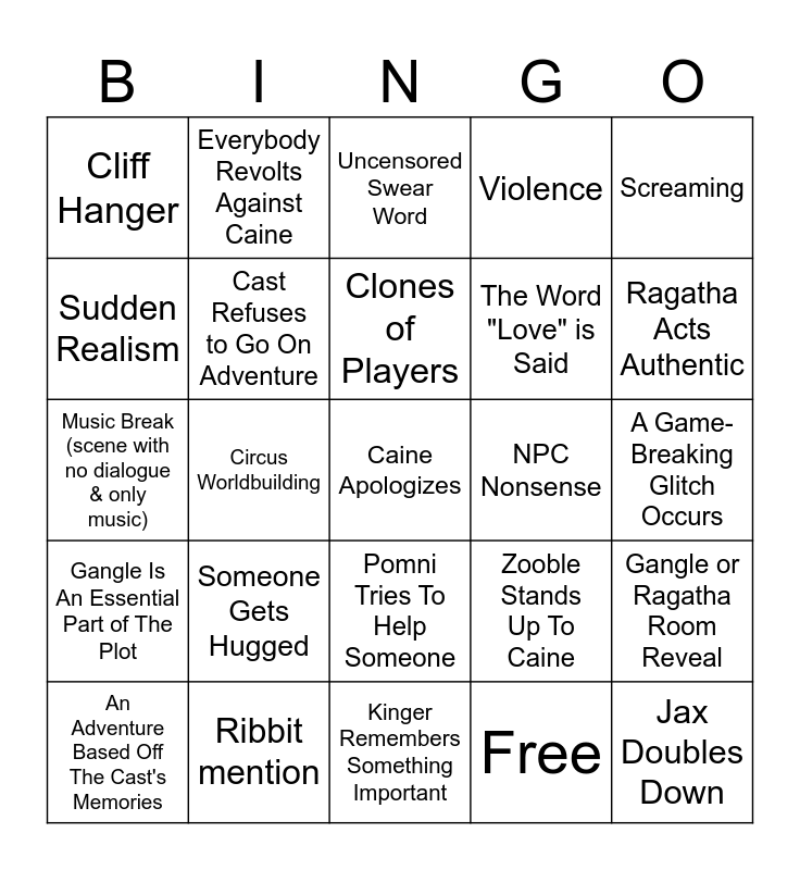 This bingo card has 30 words: Ribbit mention, Flashback, Circus Worldbuilding, Caine Does Something Messed Up, Cliff Hanger, Uncensored Swear Word, Cast Refuses to Go On Adventure, Pomni Tries To Help Someone, NPC Nonsense, Kinger Remembers Something Important, A Game-Breaking Glitch Occurs, Caine Apologizes, Free, Jax Doubles Down, Ragatha Acts Authentic, Ragatha Talks To Jax, Zooble Stands Up To Caine, Gangle Is An Essential Part of The Plot, Someone Gets Hugged, Screaming, Music Break (scene with no dialogue & only music), Cellar lore, Everybody Revolts Against Caine, The Word "Love" is Said, Sudden Realism, Violence, Gangle or Ragatha Room Reveal, An Adventure Based Off The Cast's Memories, Clones of Players and Pomni Does Something Shocking.