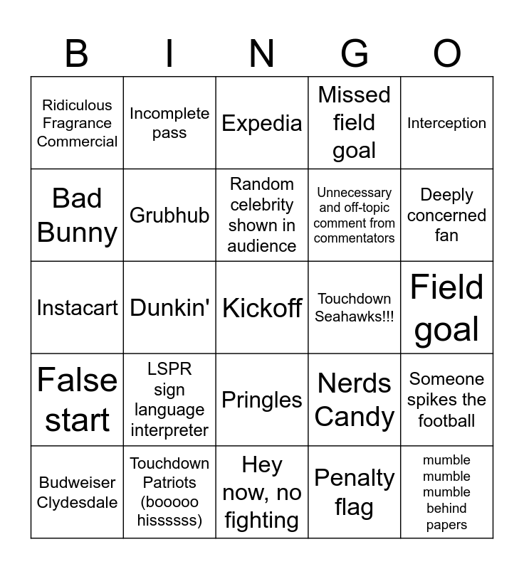 This bingo card has a free space and 29 words: Budweiser Clydesdale, Bud Light, Dunkin', e.l.f Cosmetics, Ridiculous Fragrance Commercial, Expedia, Grubhub, LSPR sign language interpreter, Touchdown Seahawks!!!, Touchdown Patriots (booooo hissssss), Field goal, mumble mumble mumble behind papers, Hey now, no fighting, Penalty flag, Deeply concerned fan, Pepsi, Pringles, False start, Interception, Instacart, Nerds Candy, Raisin Bran, Unnecessary and off-topic comment from commentators, Bad Bunny, Missed field goal, Incomplete pass, Someone spikes the football, Random celebrity shown in audience and Touchdown dance.