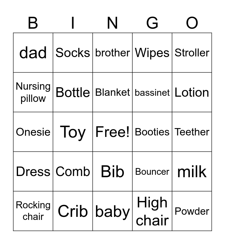This bingo card has a free space and 41 words: Diaper, Onesie, Pacifier, Bottle, Crib, Bib, Blanket, Rattle, Stroller, Dress, Toy, Wipes, Powder, Teether, Booties, Comb, Mom, dad, hat, brother, milk, pillow, baby, bassinet, Monitor, Baby feet, High chair, Car seat, Lotion, Thermometer, Mittens, Socks, Rocking chair, Play mat, Bouncer, Nursing pillow, Shampoo, Nail clippers, Book, Spoons and Walker.