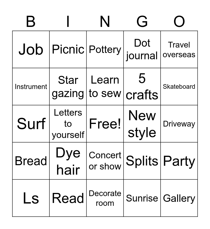 This bingo card has a free space and 24 words: Dye hair, Read, Learn to sew, Ls, Travel overseas, Job, Instrument, Picnic, New style, Concert or show, 5 crafts, Surf, Splits, Party, Star gazing, Sunrise, Driveway, Pottery, Skateboard, Letters to yourself, Gallery, Bread, Dot journal and Decorate room.