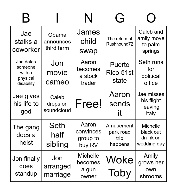 This bingo card has a free space and 24 words: Seth half sibling, Jon arranged marriage, Aaron becomes a stock trader, Jon finally does standup, Caleb and amily move to palm springs, Jae stalks a coworker, Jae dates someone with a physical disability, Obama announces third term, Aaron sends it, Aaron convinces group to buy RV, Puerto Rico 51st state, Jae gives his life to god, Amusement park road trip happens, Michelle black out drunk on wedding day, Jon movie cameo, Woke Toby, Jae misses his flight leaving italy, James child swap, Seth runs for political office, Caleb drops on soundcloud, Amily grows her own shrooms, The gang does a heist, The return of Rushhound72 and Michelle becomes a gun owner.