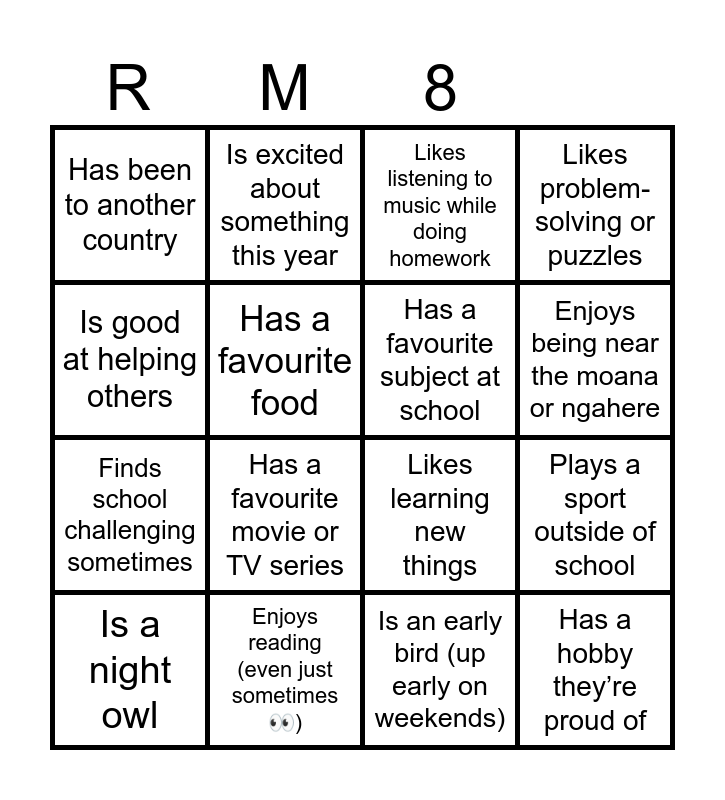 This bingo card has 30 words: Free!, Has a pet at home, Plays a sport outside of school, Can speak more than one language, Has been to another country, Likes listening to music while doing homework, Has a favourite subject at school, Finds maths challenging, Enjoys reading (even just sometimes π), Can cook or bake something by themselves, Is an early bird (up early on weekends), Is a night owl, Likes working in a group, Prefers working independently, Has a favourite movie or TV series, Enjoys art, music, or drama, Plays a musical instrument, Has a hobby theyβre proud of, Has siblings, Is good at helping others, Likes learning new things, Has a favourite place they feel calm, Is excited about something this year, Finds school challenging sometimes, Has a favourite food, Likes problem-solving or puzzles, Has been to a marae, Can say hello in another language, Enjoys being near the moana or ngahere and Has taken part in a cultural performance.