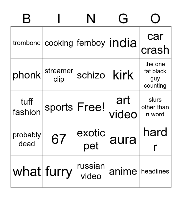 This bingo card has a free space and 24 words: 67, furry, schizo, what, car crash, trombone, phonk, cooking, art video, exotic pet, kirk, tuff fashion, aura, hard r, streamer clip, anime, slurs other than n word, femboy, the one fat black guy counting, sports, headlines, probably dead, india and russian video.