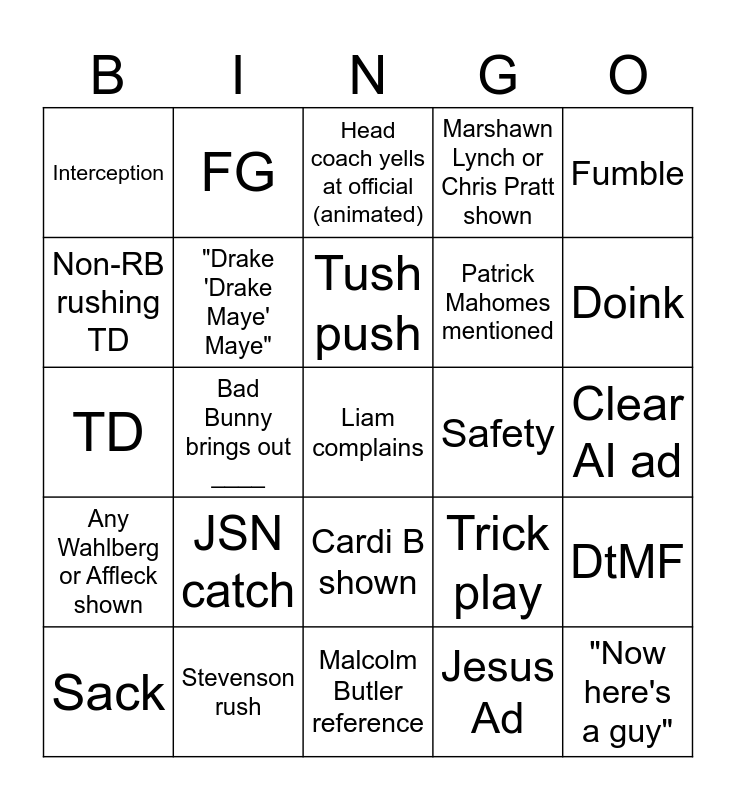 This bingo card has a free space and 24 words: JSN catch, Stevenson rush, Tush push, Sack, Fumble, Interception, Non-RB rushing TD, FG, Safety, Cardi B shown, Patrick Mahomes mentioned, TD, Trick play, DtMF, "Drake 'Drake Maye' Maye", Jesus Ad, Clear AI ad, Head coach yells at official (animated), Doink, Bad Bunny brings out ____, "Now here's a guy", Any Wahlberg or Affleck shown, Marshawn Lynch or Chris Pratt shown and Malcolm Butler reference.