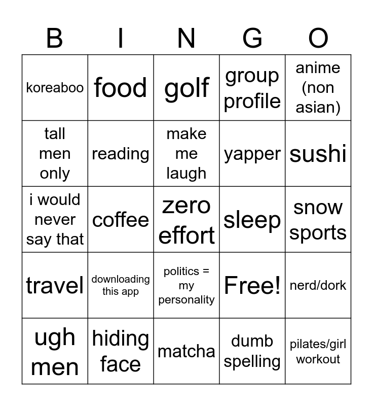 This bingo card has 25 words: downloading this app, matcha, make me laugh, ugh men, anime (non asian), koreaboo, tall men only, food, sleep, politics = my personality, yapper, i would never say that, Free!, nerd/dork, reading, pilates/girl workout, snow sports, golf, sushi, coffee, zero effort, hiding face, travel, group profile and dumb spelling.