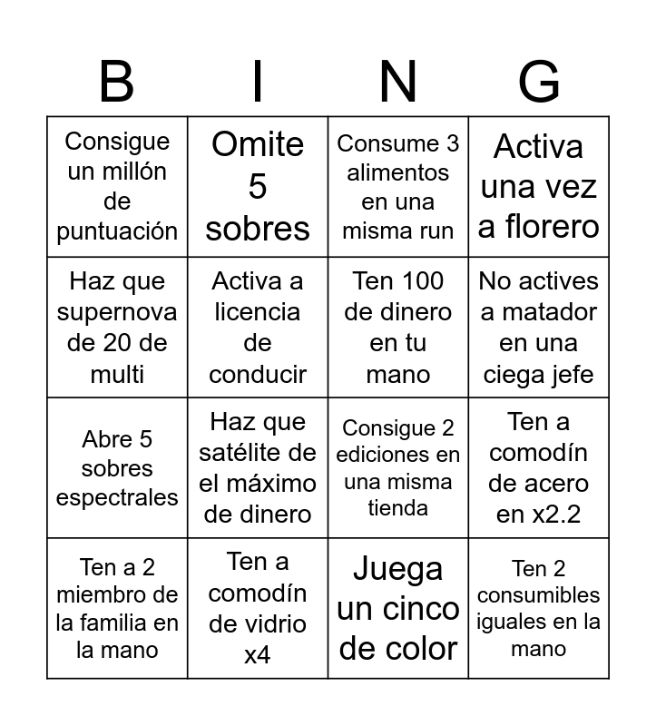This bingo card has 16 words: Ten a comodín de vidrio x4, Ten a comodín de acero en x2.2, Consume 3 alimentos en una misma run, Consigue un millón de puntuación, Abre 5 sobres espectrales, Omite 5 sobres, Consigue 2 ediciones en una misma tienda, Juega un cinco de color, Haz que supernova de 20 de multi, Activa a licencia de conducir, Ten a 2 miembro de la familia en la mano, Activa una vez a florero, Haz que satélite de el máximo de dinero, No actives a matador en una ciega jefe, Ten 100 de dinero en tu mano and Ten 2 consumibles iguales en la mano.