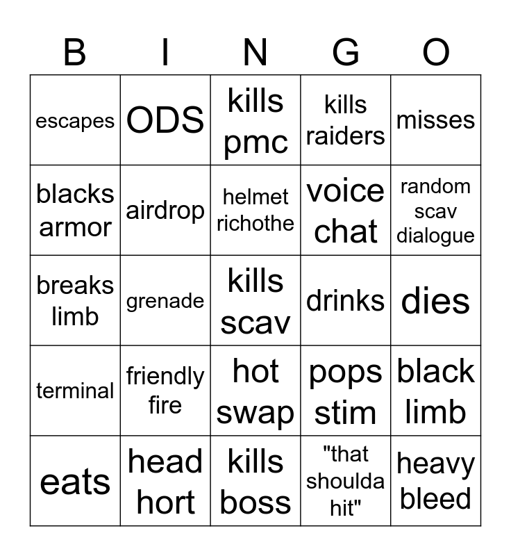 This bingo card has a free space and 24 words: friendly fire, head hort, helmet richothe, eats, misses, escapes, blacks armor, ODS, drinks, hot swap, voice chat, breaks limb, pops stim, black limb, airdrop, "that shoulda hit", dies, kills pmc, random scav dialogue, grenade, heavy bleed, terminal, kills raiders and kills boss.
