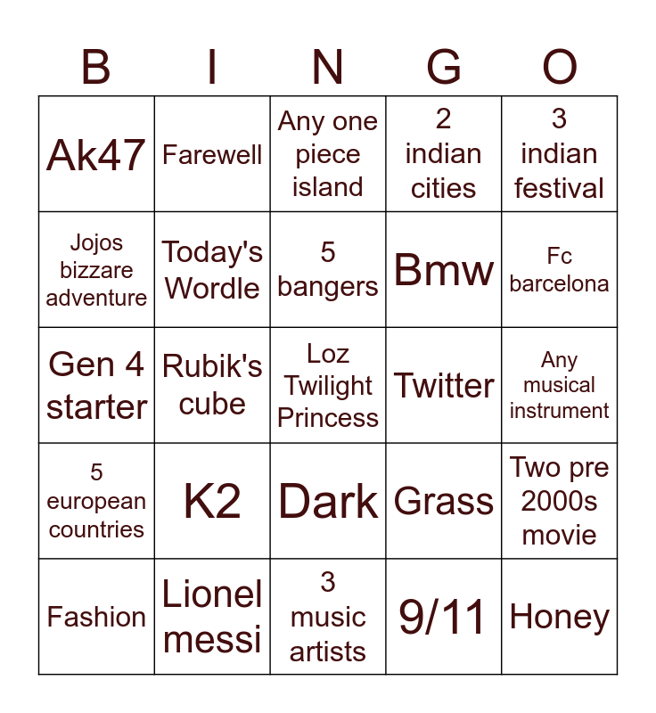 This bingo card has 25 words: 5 european countries, Lionel messi, Loz Twilight Princess, 9/11, 3 indian festival, Ak47, Farewell, Any one piece island, Twitter, Two pre 2000s movie, Jojos bizzare adventure, Today's Wordle, 3 music artists, Grass, Fc barcelona, Fashion, Rubik's cube, 5 bangers, Bmw, Any musical instrument, Gen 4 starter, K2, Dark, 2 indian cities and Honey.