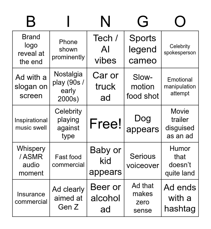 This bingo card has a free space and 25 words: Fast food commercial, Beer or alcohol ad, Car or truck ad, Insurance commercial, Celebrity spokesperson, Brand logo reveal at the end, Ad with a slogan on screen, Phone shown prominently, Dog appears, Baby or kid appears, Slow-motion food shot, Inspirational music swell, Serious voiceover, Humor that doesn’t quite land, Nostalgia play (90s / early 2000s), Ad feels way too long, Movie trailer disguised as an ad, Tech / AI vibes, Emotional manipulation attempt, Celebrity playing against type, Ad ends with a hashtag, Ad clearly aimed at Gen Z, Whispery / ASMR audio moment, Sports legend cameo and Ad that makes zero sense.