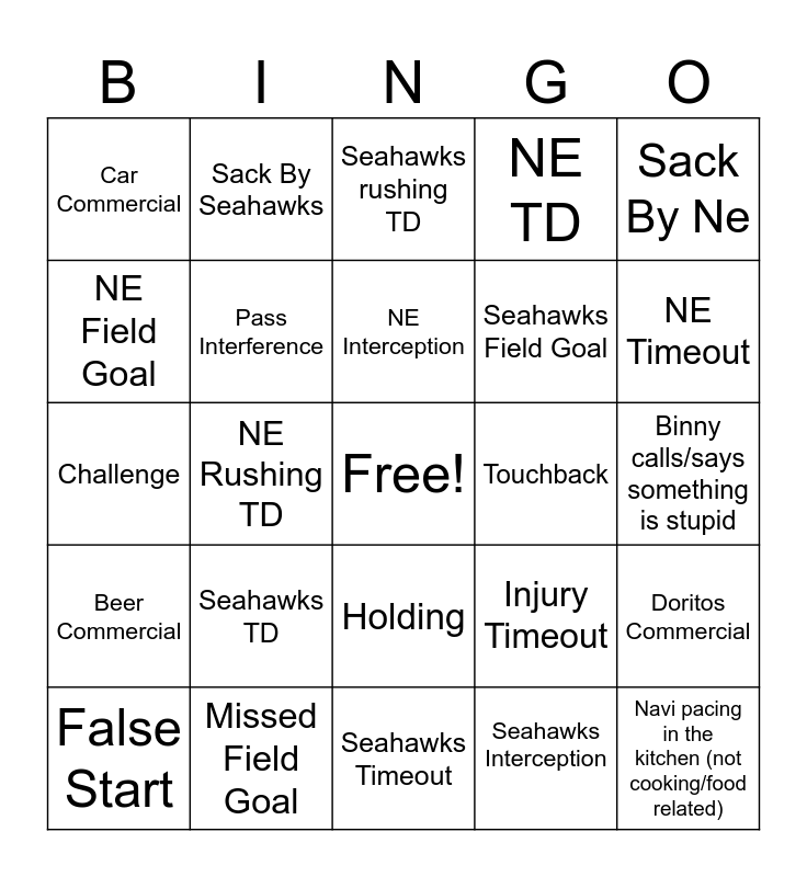 This bingo card has a free space and 24 words: Seahawks TD, Missed Field Goal, NE Interception, False Start, Sack By Ne, Car Commercial, NE Field Goal, Sack By Seahawks, Touchback, Holding, Seahawks Field Goal, Challenge, Injury Timeout, Doritos Commercial, Pass Interference, Seahawks Interception, Binny calls/says something is stupid, Seahawks rushing TD, NE Timeout, NE Rushing TD, Navi pacing in the kitchen (not cooking/food related), Beer Commercial, NE TD and Seahawks Timeout.