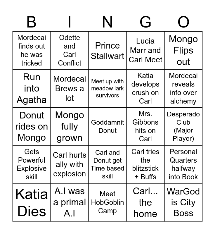 This bingo card has a free space and 24 words: Carl hurts ally with explosion, A.I was a primal A.I, Meet up with meadow lark survivors, Katia Dies, Mongo Flips out, Mordecai finds out he was tricked, Run into Agatha, Odette and Carl Conflict, Mrs. Gibbons hits on Carl, Carl and Donut get Time based skill, Katia develops crush on Carl, Donut rides on Mongo, Carl tries the blitzstick + Buffs, Personal Quarters halfway into Book, Mordecai Brews a lot, Carl... the home, Desperado Club (Major Player), Prince Stallwart, Mordecai reveals info over alchemy, Mongo fully grown, WarGod is City Boss, Gets Powerful Explosive skill, Lucia Marr and Carl Meet and Meet HobGoblin Camp.