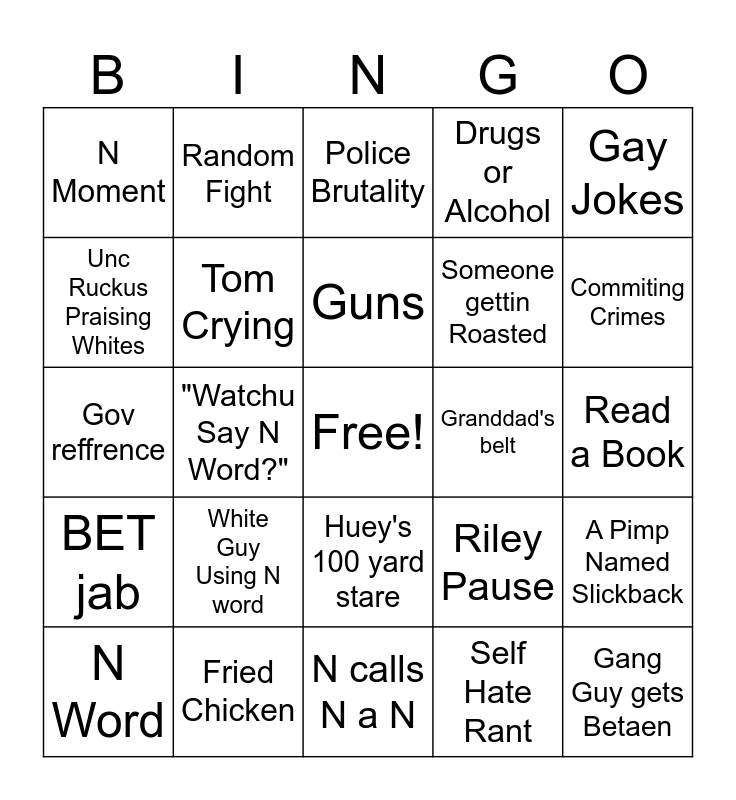 This bingo card has a free space and 24 words: White Guy Using N word, Fried Chicken, Guns, N Word, Gay Jokes, N Moment, Unc Ruckus Praising Whites, Random Fight, Granddad's belt, Huey's 100 yard stare, Someone gettin Roasted, Gov reffrence, Riley Pause, A Pimp Named Slickback, Tom Crying, Self Hate Rant, Read a Book, Police Brutality, Commiting Crimes, "Watchu Say N Word?", Gang Guy gets Betaen, BET jab, Drugs or Alcohol and N calls N a N.