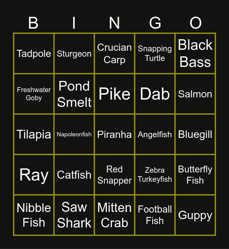 This bingo card has 80 words: Bitterling, Pale Chub, Crucian Carp, Dace, Carp, Koi, Goldfish, Pop-eyed Goldfish, Ranchu Goldfish, Killifish, Crawfish, Soft-shelled Turtle, Snapping Turtle, Tadpole, Frog, Freshwater Goby, Loach, Catfish, Giant Snakehead, Bluegill, Yellow Perch, Black Bass, Tilapia, Pike, Pond Smelt, Sweetfish, Cherry Salmon, Char, Golden Trout, Stringfish, Salmon, King Salmon, Mitten Crab, Guppy, Nibble Fish, Angelfish, Betta, Neon Tetra, Rainbowfish, Piranha, Arowana, Dorado, Gar, Arapaima, Saddled Bichir, Sturgeon, Sea Butterfly, Sea Horse, Clownfish, Surgeonfish, Butterfly Fish, Napoleonfish, Zebra Turkeyfish, Blowfish, Puffer Fish, Anchovy, Horse Mackerel, Barred Knifejaw, Sea Bass, Red Snapper, Dab, Olive Flounder, Squid, Moray Eel, Ribbon Eel, Tuna, Blue Marlin, Giant Trevally, Mahi-mahi, Ocean Sunfish, Ray, Saw Shark, Hammerhead Shark, Great White Shark, Whale Shark, Suckerfish, Football Fish, Oarfish, Barreleye and Coelacanth.