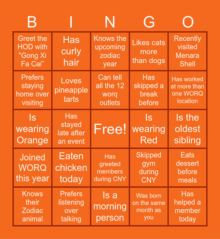 This bingo card has a free space and 24 words: Knows their Zodiac animal, Eaten chicken today, Can tell all the 12 worq outlets, Was born on the same month as you, Recently visited Menara Shell, Greet the HOD with "Gong Xi Fa Cai”, Has curly hair, Knows the upcoming zodiac year, Is wearing Red, Is the oldest sibling, Is wearing Orange, Loves pineapple tarts, Skipped gym during CNY, Eats dessert before meals, Prefers staying home over visiting, Prefers listening over talking, Is a morning person, Likes cats more than dogs, Has worked at more than one WORQ location, Joined WORQ this year, Has stayed late after an event, Has greeted members during CNY, Has skipped a break before and Has helped a member today.