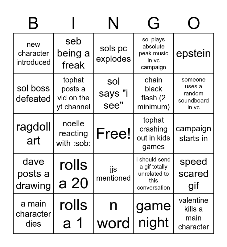 This bingo card has a free space and 24 words: rolls a 20, rolls a 1, sol says "i see", a main character dies, epstein, new character introduced, sol boss defeated, seb being a freak, tophat crashing out in kids games, jjs mentioned, chain black flash (2 minimum), ragdoll art, i should send a gif totally unrelated to this conversation, speed scared gif, tophat posts a vid on the yt channel, game night, campaign starts in, sols pc explodes, someone uses a random soundboard in vc, noelle reacting with :sob:, valentine kills a main character, dave posts a drawing, sol plays absolute peak music in vc campaign and n word.