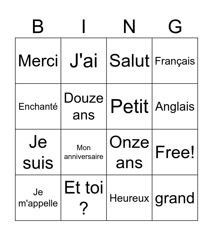 This bingo card has 20 words: Free!, Bonjour, Salut, Ça va?, Je m'appelle, Enchanté, Et toi ?, Merci, Je suis, J'ai, Mon anniversaire, Onze ans, Douze ans, grand, Petit, Vert, Anglais, Français, Heureux and Chat.