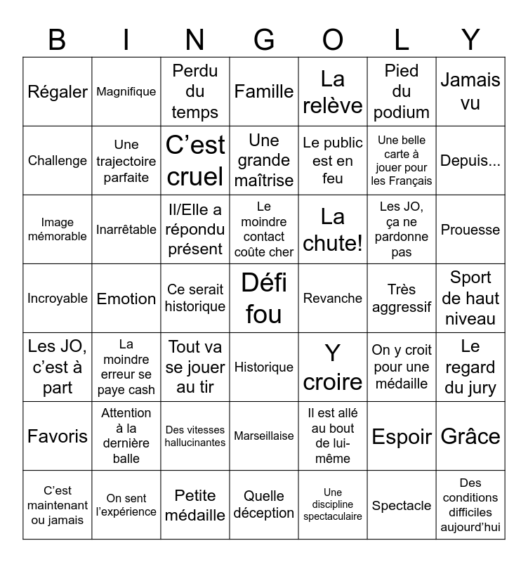 This bingo card has 73 words: Free!, Historique, Régaler, Favoris, Parfait, Pari fou, Inarrêtable, Quelle déception, La chute!, Outsider, Défi fou, Record, Jamais vu, Image mémorable, Genoux, Magnifique, Emotion, Pied du podium, Spectacle, Depuis..., Challenge, Famille, La relève, Revanche, Prouesse, Grâce, Marseillaise, Espoir, Y croire, Petite médaille, Incroyable, Des conditions difficiles aujourd’hui, Le froid joue un rôle clé, Une ambiance incroyable ici, Le public est en feu, Les JO, c’est à part, Il ne faut pas se rater à ce niveau-là, La pression est énorme, Une belle carte à jouer pour les Français, On y croit pour une médaille, Ce serait historique, Il/Elle a répondu présent, On sent l’expérience, Une prise de risque maximale, Il attaque fort, Une trajectoire parfaite, Perdu du temps, La moindre erreur se paye cash, La technique ET l’artistique, Une grande maîtrise, Le regard du jury, Il skie sur un fil, Un programme sans faute, Des vitesses hallucinantes, Très aggressif, Chaque centième compte, Une discipline spectaculaire, Le moindre contact coûte cher, Tout va se jouer au tir, Il faut gérer son effort, Attention à la dernière balle, Le tir debout est décisif, Il a le rythme, C’est cruel, Sport de haut niveau, Il n’a rien à se reprocher, Il est allé au bout de lui-même, C’est maintenant ou jamais, Les JO, ça ne pardonne pas, C’est magnifique, Il s’est fait plaisir, Quelle équipe and Surpassé.