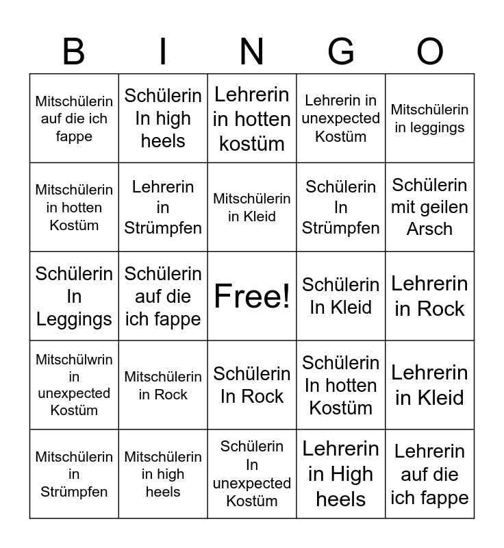 This bingo card has a free space and 24 words: Mitschülerin in Rock, Mitschülerin in high heels, Mitschülerin in Kleid, Mitschülerin in Strümpfen, Mitschülerin in leggings, Mitschülerin auf die ich fappe, Mitschülerin in hotten Kostüm, Schülerin In high heels, Schülerin In Kleid, Schülerin In Rock, Schülerin In Strümpfen, Schülerin In Leggings, Schülerin In hotten Kostüm, Lehrerin in Kleid, Lehrerin in Strümpfen, Lehrerin in High heels, Lehrerin in Rock, Lehrerin in hotten kostüm, Schülerin mit geilen Arsch, Schülerin auf die ich fappe, Lehrerin auf die ich fappe, Mitschülwrin in unexpected Kostüm, Lehrerin in unexpected Kostüm and Schülerin In unexpected Kostüm.