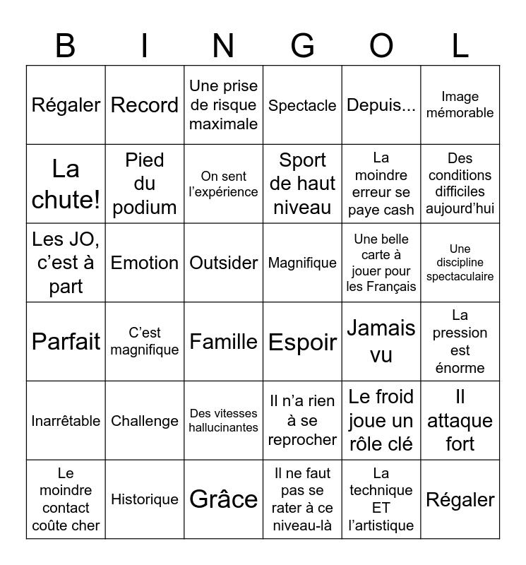 This bingo card has 73 words: Historique, Historique, Régaler, Régaler, Favoris, Favoris, Magnifique, Magnifique, Parfait, Pari fou, Inarrêtable, Quelle déception, La chute!, Outsider, Défi fou, Record, Jamais vu, Image mémorable, Genoux, Emotion, Pied du podium, Spectacle, Depuis..., Challenge, Famille, La relève, Revanche, Prouesse, Grâce, Marseillaise, Espoir, Y croire, Petite médaille, Incroyable, Des conditions difficiles aujourd’hui, Le froid joue un rôle clé, Une ambiance incroyable ici, Le public est en feu, Les JO, c’est à part, Il ne faut pas se rater à ce niveau-là, La pression est énorme, Une belle carte à jouer pour les Français, On y croit pour une médaille, Ce serait historique, Il/Elle a répondu présent, On sent l’expérience, Une prise de risque maximale, Il attaque fort, Une trajectoire parfaite, La moindre erreur se paye cash, La technique ET l’artistique, Une grande maîtrise, Le regard du jury, Un programme sans faute, Des vitesses hallucinantes, Très aggressif, Chaque centième compte, Une discipline spectaculaire, Le moindre contact coûte cher, Tout va se jouer au tir, Attention à la dernière balle, Il a le rythme, C’est cruel, Sport de haut niveau, Il n’a rien à se reprocher, Il est allé au bout de lui-même, C’est maintenant ou jamais, Les JO, ça ne pardonne pas, C’est magnifique, Il s’est fait plaisir, Quelle équipe, Surpassé and Caresser la neige.
