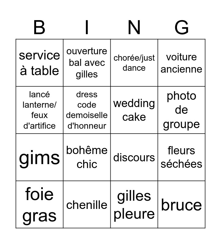 This bingo card has 16 words: chenille, fleurs séchées, chorée/just dance, service à table, gims, ouverture bal avec gilles, discours, gilles pleure, lancé lanterne/ feux d'artifice, dress code demoiselle d'honneur, foie gras, voiture ancienne, bohême chic, photo de groupe, wedding cake and bruce.