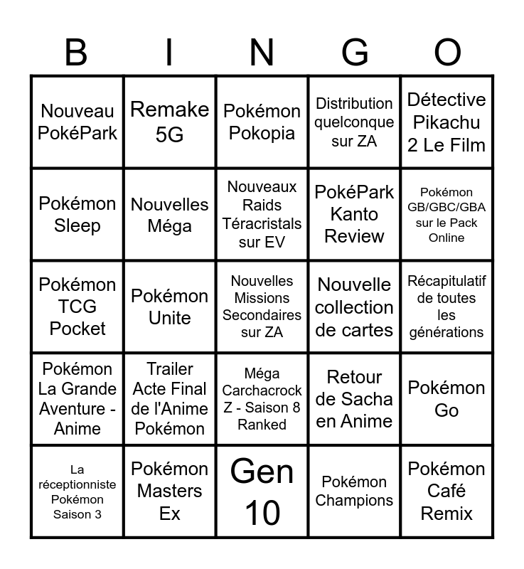 This bingo card has 25 words: Pokémon La Grande Aventure - Anime, Pokémon Masters Ex, Nouvelles Missions Secondaires sur ZA, Pokémon Champions, Détective Pikachu 2 Le Film, Nouveau PokéPark, Remake 5G, Pokémon Pokopia, Nouvelle collection de cartes, Pokémon Go, Pokémon Sleep, Nouvelles Méga, Gen 10, Retour de Sacha en Anime, Pokémon GB/GBC/GBA sur le Pack Online, La réceptionniste Pokémon Saison 3, Pokémon Unite, Nouveaux Raids Téracristals sur EV, PokéPark Kanto Review, Récapitulatif de toutes les générations, Pokémon TCG Pocket, Trailer Acte Final de l'Anime Pokémon, Méga Carchacrock Z - Saison 8 Ranked, Distribution quelconque sur ZA and Pokémon Café Remix.