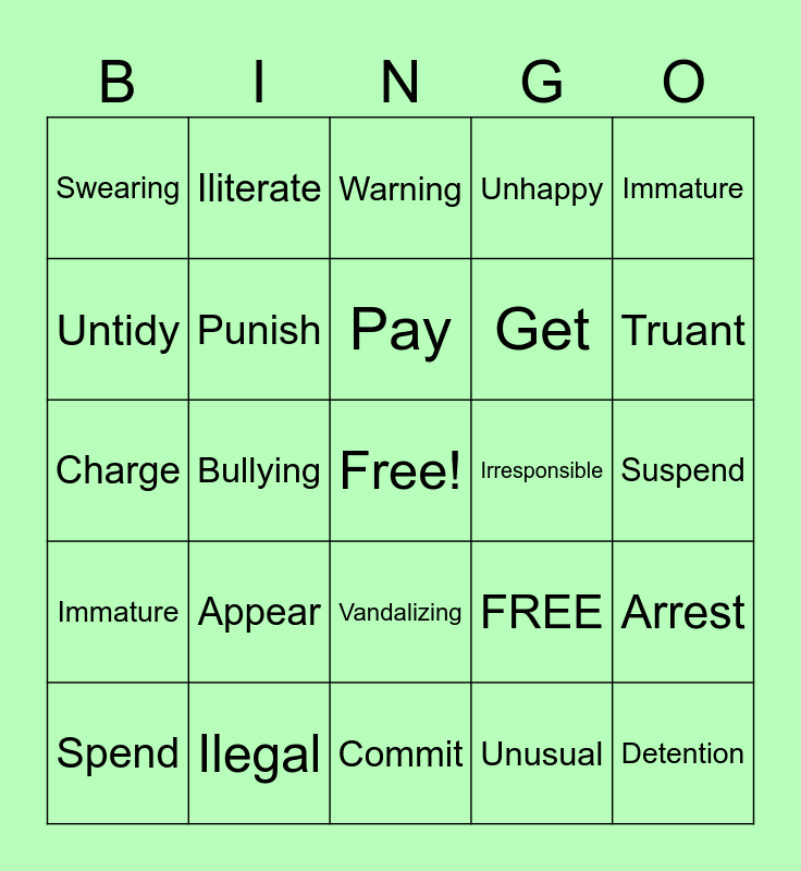 This bingo card has a free space and 25 words: Appear, Commit, Pay, Spend, Immature, Swearing, Untidy, Iliterate, Irresponsible, Vandalizing, Get, Charge, FREE, Arrest, Punish, Expel, Suspend, Warning, Truant, Bullying, Detention, Ilegal, Immature, Unhappy and Unusual.