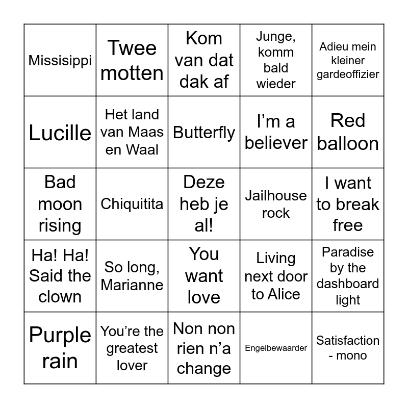 This bingo card has a free space and 50 words: Annabel, Satisfaction - mono, Nikita, Non non rien n’a change, So long, Marianne, Summer of ‘69, Twee motten, Pour un flirt, Lucille, Rivers of Babylon, Het land van Maas en Waal, Junge, komm bald wieder, Paradise by the dashboard light, Living next door to Alice, Twee reebruine ogen, Manic monday, Butterfly, Jailhouse rock, Huilen is voor jou te laat, Adieu mein kleiner gardeoffizier, Chiquitita, Engelbewaarder, Missisippi, I’m a believer, Johnny b. Goode, Zorba’s dance, Red balloon, Immer weider Sonntags, Kom van dat dak af, You want love, Rosamunde, Pastorale, Kronenburg park, Penny lane, You’re the greatest lover, Ich hab’ die liebe geseh’n, La paloma adieu, Waarom fluister ik je naam nog, On silent wings, I want to break free, Ramona, Denis, Late at night, One way wind, Purple rain, Bad moon rising, Peter, Hello Mary Lou, Ha! Ha! Said the clown and Hè, kom aan.