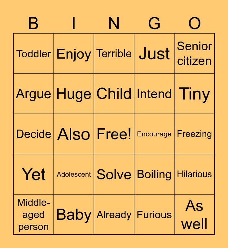 This bingo card has a free space and 24 words: Adolescent, Baby, Child, Middle-aged person, Senior citizen, Toddler, Argue, Enjoy, Encourage, Solve, Intend, Decide, Boiling, Hilarious, Huge, Furious, Freezing, Terrible, Tiny, Also, As well, Yet, Just and Already.