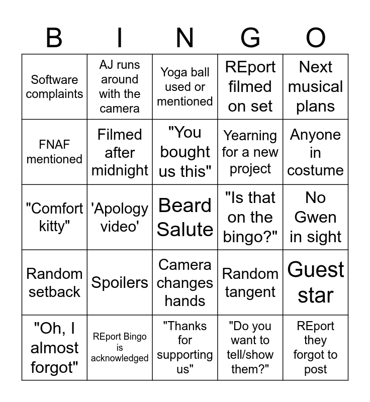 This bingo card has a free space and 48 words: 15+ Minutes Long, REport they forgot to post, 1 Week+ Since Last, "Thanks for supporting us", Spoilers, Mention of Patreon perks, AJ runs around with the camera, Mr Meowse, FNAF mentioned, Snippet of music/video, Filmed after midnight, REport filmed on set, Guest star, Random tangent, The P'nelope, Good/Bad news, "You bought us this", "Is that on the bingo?", "So you want to work at Random Encounters", Next musical plans, 'Apology video', "Do you want to tell/show them?", Software complaints, Yearning for a new project, Animation news, Anyone in costume, "Oh, I almost forgot", Someone other than AJ performs beard salute, Camera changes hands, Random setback, Weird intro, No Nate in sight, REport is a surprise to those in it, AJ complains about Gwen's speakers, REport Bingo is acknowledged, Camera holder waves at their reflection, Another REport is mentioned (REportception), No Gwen in sight, Mention of 'legal', No cats in sight, Pop culture reference, Éloïse is mentioned or appears, Yoga ball used or mentioned, RE deliberately get a bingo square, "Comfort kitty", RE trio are all present, Bill and Unboxing video.