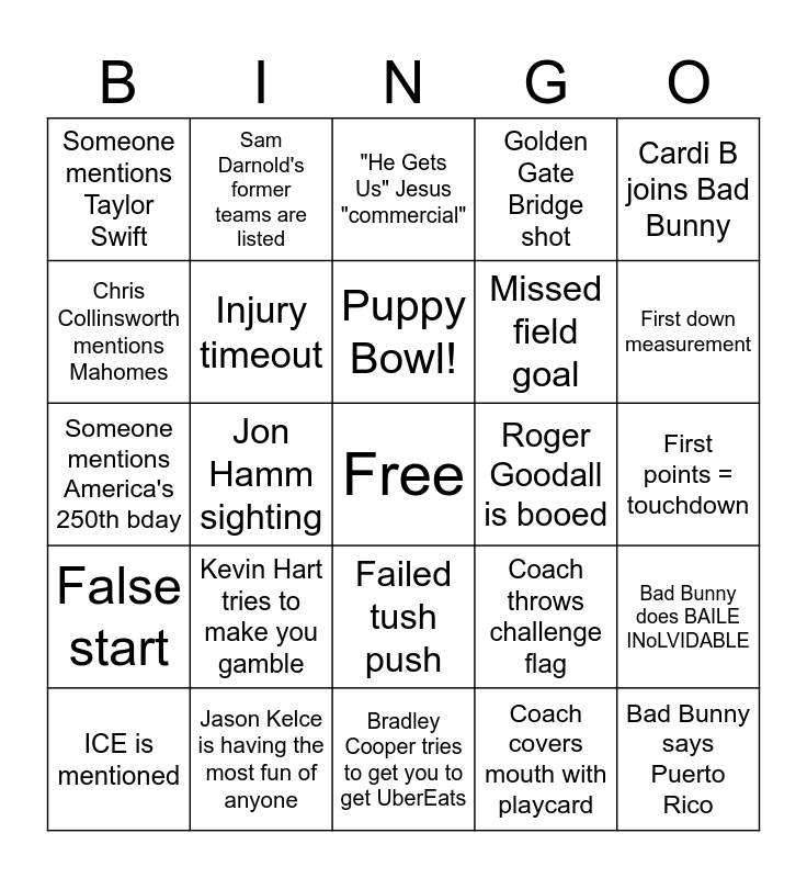 This bingo card has a free space and 24 words: Kevin Hart tries to make you gamble, Jason Kelce is having the most fun of anyone, Puppy Bowl!, ICE is mentioned, Cardi B joins Bad Bunny, Someone mentions Taylor Swift, Chris Collinsworth mentions Mahomes, Sam Darnold's former teams are listed, Roger Goodall is booed, Failed tush push, Missed field goal, Someone mentions America's 250th bday, Coach throws challenge flag, Bad Bunny does BAILE INoLVIDABLE, Injury timeout, Coach covers mouth with playcard, First points = touchdown, "He Gets Us" Jesus "commercial", First down measurement, Jon Hamm sighting, Bad Bunny says Puerto Rico, False start, Golden Gate Bridge shot and Bradley Cooper tries to get you to get UberEats.