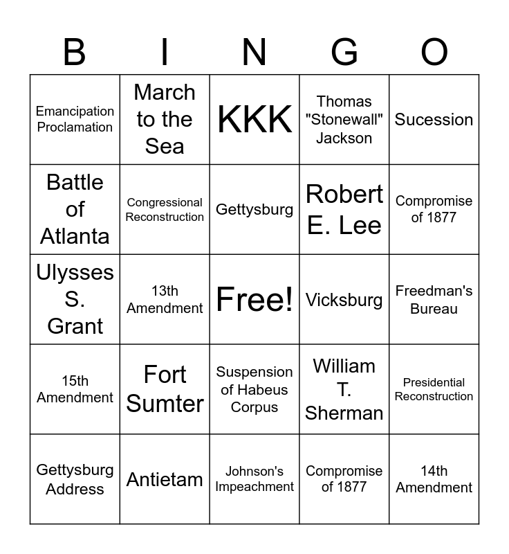 This bingo card has a free space and 24 words: Fort Sumter, Antietam, Gettysburg, Gettysburg Address, Sucession, Emancipation Proclamation, Battle of Atlanta, March to the Sea, Vicksburg, Suspension of Habeus Corpus, Robert E. Lee, Ulysses S. Grant, William T. Sherman, Presidential Reconstruction, Congressional Reconstruction, Compromise of 1877, Freedman's Bureau, KKK, Compromise of 1877, 13th Amendment, 14th Amendment, 15th Amendment, Thomas "Stonewall" Jackson and Johnson's Impeachment.