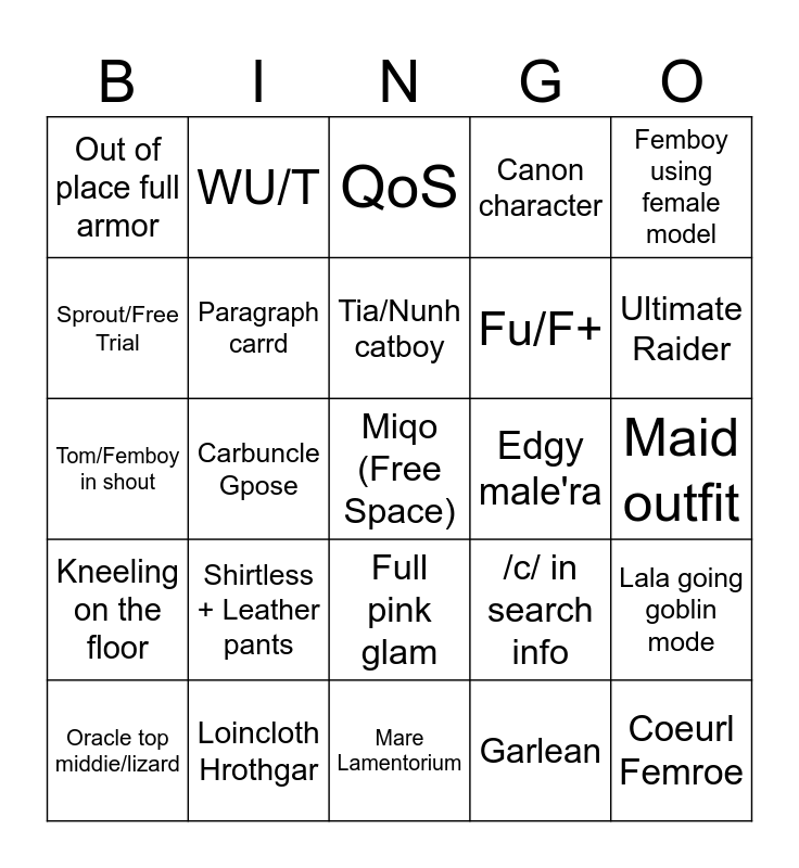 This bingo card has a free space and 27 words: /c/ in search info, Raceplayer, Fu/F+, Mare Lamentorium, Sprout/Free Trial, QoS, WU/T, Kneeling on the floor, Edgy male'ra, Lala going goblin mode, Tom/Femboy in shout, Canon character, Oracle top middie/lizard, Loincloth Hrothgar, Ultimate Raider, Hidden ERP in corner, Paragraph carrd, Tia/Nunh catboy, Shirtless + Leather pants, Out of place full armor, Maid outfit, Garlean, Carbuncle Gpose, Coeurl Femroe, Full pink glam, Femboy using female model and ERP Mistell.
