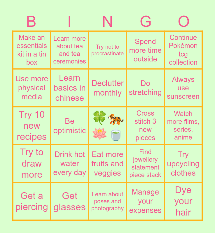 This bingo card has a free space and 24 words: Drink hot water every day, Get glasses, Declutter monthly, Get a piercing, Continue Pokémon tcg collection, Make an essentials kit in a tin box, Use more physical media, Learn more about tea and tea ceremonies, Cross stitch 3 new pieces, Eat more fruits and veggies, Do stretching, Try 10 new recipes, Find jewellery statement piece stack, Try upcycling clothes, Learn basics in chinese, Manage your expenses, Watch more films, series, anime, Try not to procrastinate, Always use sunscreen, Be optimistic, Dye your hair, Try to draw more, Spend more time outside and Learn about poses and photography.
