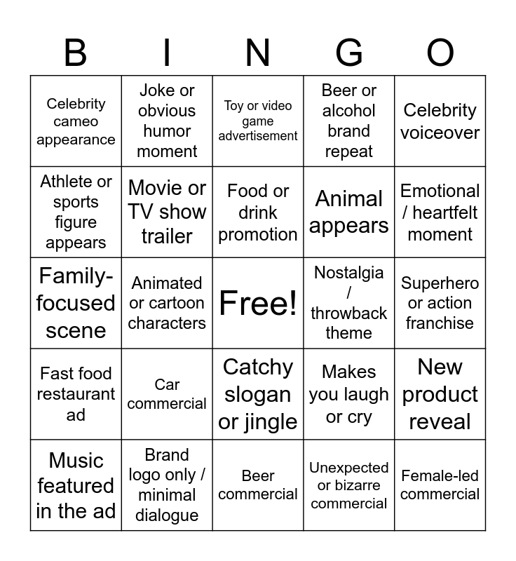 This bingo card has a free space and 25 words: Car commercial, Beer commercial, Food or drink promotion, Music featured in the ad, Celebrity voiceover, Celebrity cameo appearance, Athlete or sports figure appears, Joke or obvious humor moment, Nostalgia / throwback theme, Catchy slogan or jingle, Animal appears, Family-focused scene, Makes you laugh or cry, New product reveal, Movie or TV show trailer, Technology-focused ad, Superhero or action franchise, Toy or video game advertisement, Emotional / heartfelt moment, Animated or cartoon characters, Female-led commercial, Brand logo only / minimal dialogue, Fast food restaurant ad, Beer or alcohol brand repeat and Unexpected or bizarre commercial.