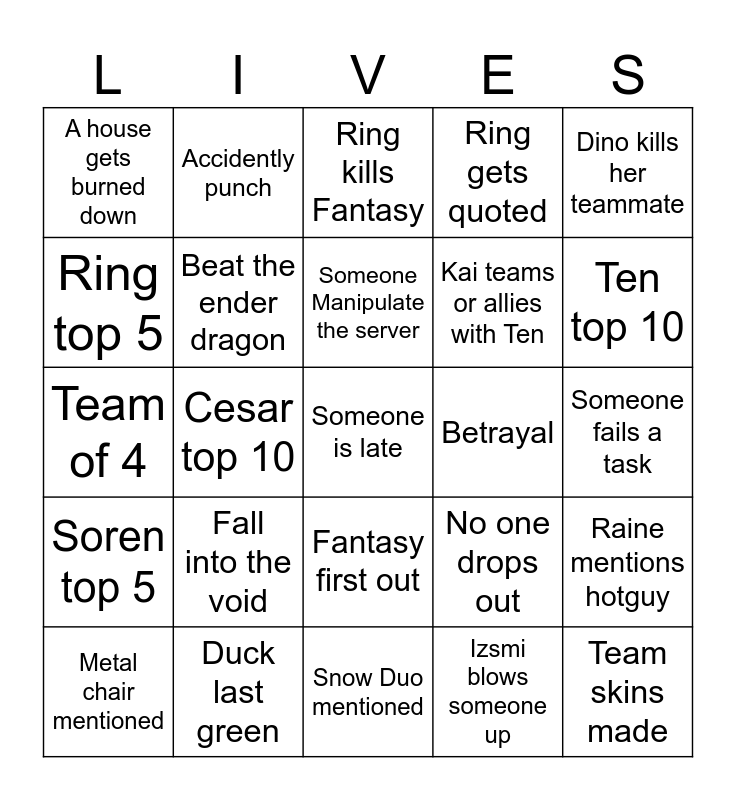 This bingo card has a free space and 24 words: Fall into the void, Duck last green, Someone Manipulate the server, Metal chair mentioned, Dino kills her teammate, A house gets burned down, Ring top 5, Accidently punch, Betrayal, Fantasy first out, Kai teams or allies with Ten, Team of 4, No one drops out, Raine mentions hotguy, Beat the ender dragon, Izsmi blows someone up, Someone fails a task, Ring kills Fantasy, Ten top 10, Cesar top 10, Team skins made, Soren top 5, Ring gets quoted and Snow Duo mentioned.