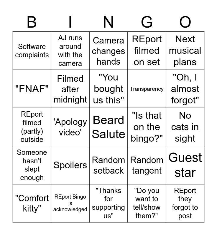 This bingo card has a free space and 50 words: 15+ Minutes Long, REport they forgot to post, Gwen and knives, "Thanks for supporting us", Spoilers, Mention of Patreon perks, AJ runs around with the camera, Mr Meowse, "FNAF", Snippet of music/video, Filmed after midnight, REport filmed on set, Guest star, Random tangent, The P'nelope, Good/Bad news, "You bought us this", "Is that on the bingo?", "So you want to work at Random Encounters", Next musical plans, 'Apology video', "Do you want to tell/show them?", Software complaints, Transparency, Animation news, Anyone in costume, "Oh, I almost forgot", Someone other than AJ performs beard salute, Camera changes hands, Random setback, Weird intro, someone is wearing a costume just for fun, REport is a surprise to those in it, Youtube complaints, REport Bingo is acknowledged, Camera holder waves at their reflection, Another REport is mentioned (REportception), RE asks Patreon a question, Mention of 'legal', No cats in sight, Pop culture reference, Éloïse/Nate is mentioned or appears, RE mentions they’re going to eat after the the report, RE deliberately get a bingo square, "Comfort kitty", REport filmed (partly) outside, Bill, Unboxing video, Someone hasn’t slept enough and REport starts on the cats.