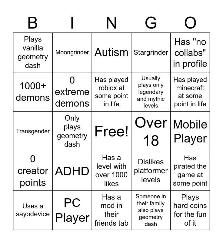 This bingo card has a free space and 24 words: ADHD, PC Player, Has played roblox at some point in life, Uses a sayodevice, Has "no collabs" in profile, Plays vanilla geometry dash, 1000+ demons, Moongrinder, Over 18, Has a level with over 1000 likes, Usually plays only legendary and mythic levels, Transgender, Dislikes platformer levels, Has pirated the game at some point, 0 extreme demons, Someone in their family also plays geometry dash, Mobile Player, Autism, Has played minecraft at some point in life, Only plays geometry dash, Plays hard coins for the fun of it, 0 creator points, Stargrinder and Has a mod in their friends tab.