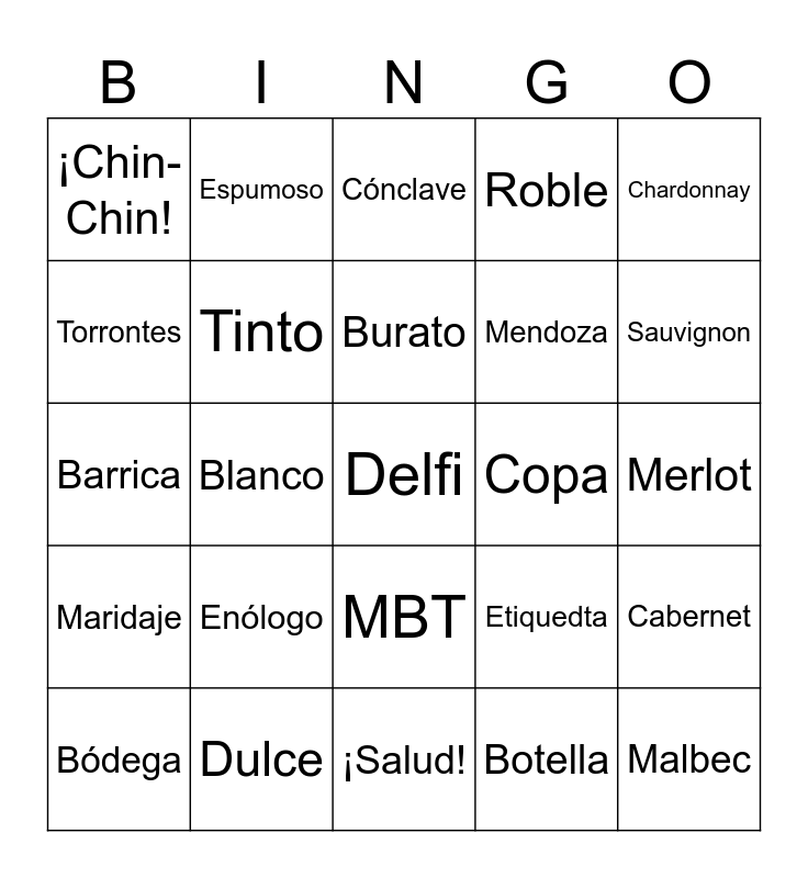 This bingo card has 30 words: Bódega, Rosado, Burato, Viñedo, Chardonnay, ¡Chin-Chin!, Espumoso, MBT, Copa, Malbec, Maridaje, Tinto, Kike, Botella, Cabernet, Saca Corcho, Blanco, Delfi, Etiquedta, Sauvignon, Barrica, Dulce, Cónclave, Mendoza, Merlot, Torrontes, Enólogo, ¡Salud!, Roble and Novia.