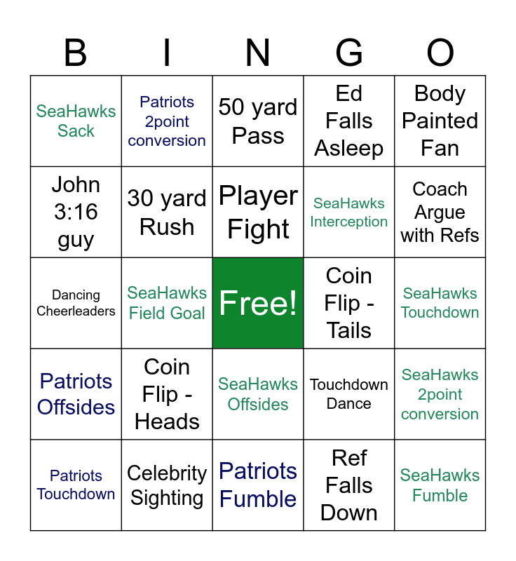 This bingo card has a free space and 29 words: Patriots Touchdown, Patriots Field Goal, SeaHawks Field Goal, Patriots Sack, SeaHawks Sack, 50 yard Pass, 30 yard Rush, Coin Flip - Heads, Coin Flip - Tails, Celebrity Sighting, SeaHawks Touchdown, SeaHawks Fumble, Patriots Fumble, Ref Falls Down, Coach Argue with Refs, Tush Push, SeaHawks Offsides, Patriots Offsides, Body Painted Fan, Dancing Cheerleaders, Touchdown Dance, Patriots Interception, SeaHawks Interception, John 3:16 guy, Ed Falls Asleep, Patriots 2point conversion, SeaHawks 2point conversion, Player Fight and Ambulance on Field.