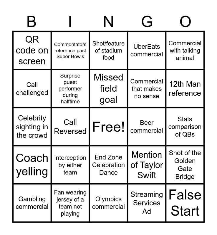 This bingo card has a free space and 35 words: Pass Interference, Seahawks fumble, Patriots fumble, Surprise guest performer during halftime, End Zone Celebration Dance, UberEats commercial, Call challenged, Fan with face paint at the game, Missed field goal, MARVEL movie commercial, Celebrity sighting in the crowd, Commercial with talking animal, Commentator mentions the weather, Coach chewing gum, QR code on screen, Beer commercial, Streaming Services Ad, Call Reversed, Coach yelling, False Start, Mention of Taylor Swift, Gambling commercial, Shot of the Golden Gate Bridge, Fan wearing jersey of a team not playing, Shot/feature of stadium food, 12th Man reference, Tom Brady sighting, Someone using musical instrument during halftime show, Commercial that makes no sense, Stats comparison of QBs, Player gets emotional during interview, Olympics commercial, Interception by either team, Commentators reference past Super Bowls and Tush Push.