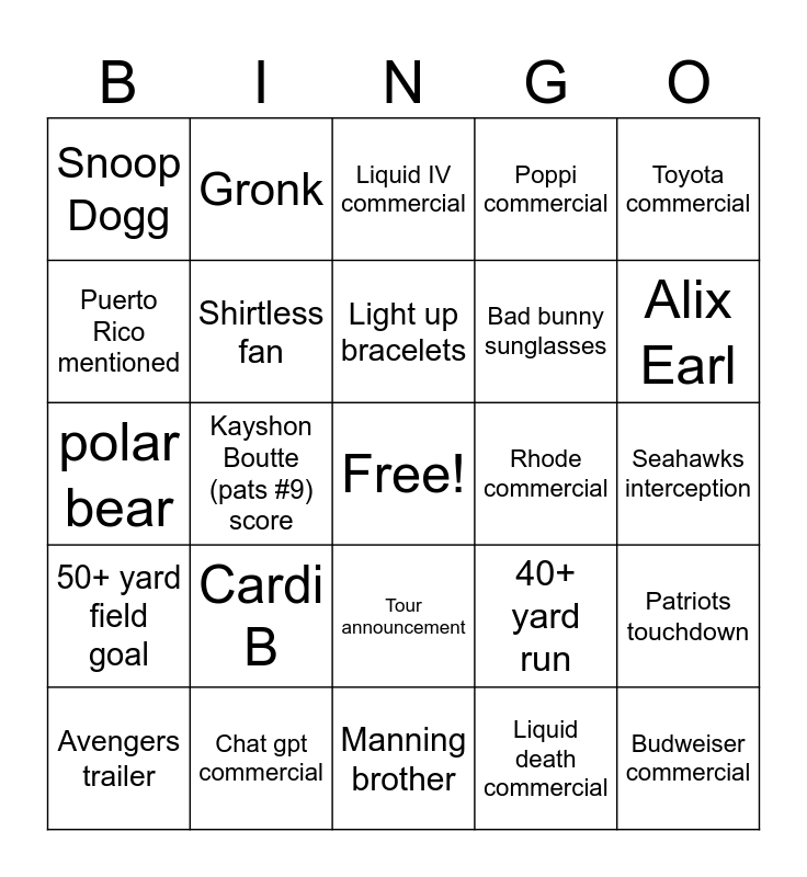 This bingo card has a free space and 45 words: Dove commercial, Budweiser commercial, Michelob ultra commercial, Avengers trailer, State Farm commercial, Liquid death commercial, Liquid IV commercial, UBER eats commercial, Toyota commercial, Chat gpt commercial, Poppi commercial, Rhode commercial, Tour announcement, Cardi B, Mr. Beast, Manning brother, Kendall Jenner, polar bear, Tom Brady, Alix Earl, Gronk, Serena Williams, Sabrina Carpenter, Snoop Dogg, The rock and Kevin hart, Seahawks interception, Patriots interception, Missed field goal, 40+ yard run, 50+ yard field goal, 2 point conversion made, Patriots touchdown, Seahawks touchdown, Stefon Diggs (pats #8) score, Hunter Henry (pats #85) score, Kayshon Boutte (pats #9) score, AJ Barner (sea #88) score, Jaxon Smith-Njiba (sea #11) score, Kenneth Walker (sea #9) score, Light up bracelets, Puerto Rico mentioned, Bad bunny sunglasses, ICE OUT, Shirtless fan and Jayden on screen.