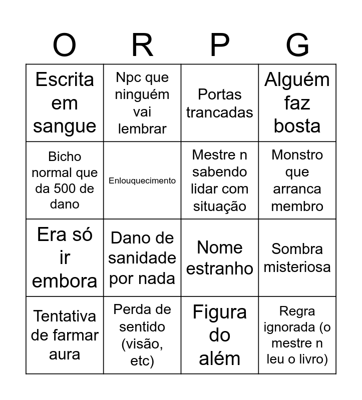 This bingo card has 16 words: Perda de sentido (visão, etc), Sombra misteriosa, Portas trancadas, Escrita em sangue, Era só ir embora, Npc que ninguém vai lembrar, Nome estranho, Figura do além, Bicho normal que da 500 de dano, Enlouquecimento, Tentativa de farmar aura, Alguém faz bosta, Dano de sanidade por nada, Monstro que arranca membro, Mestre n sabendo lidar com situação and Regra ignorada (o mestre n leu o livro).