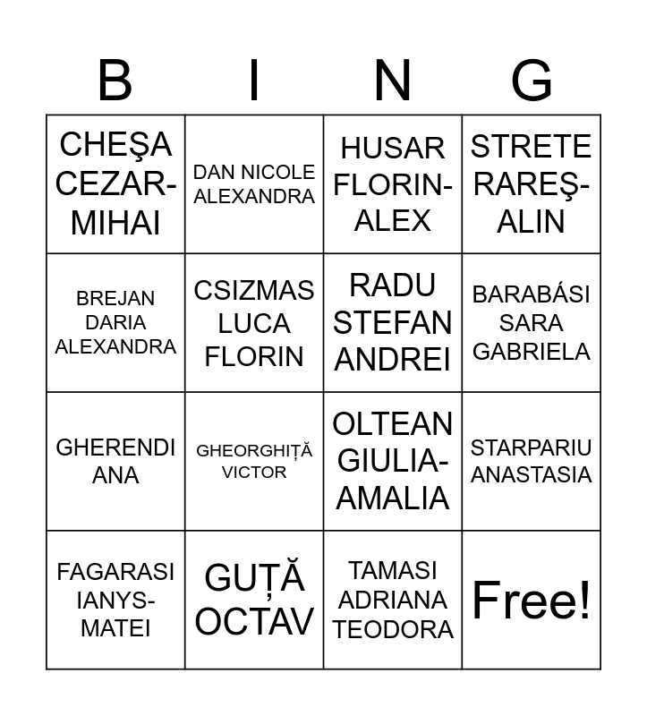 This bingo card has 23 words: Free!, AILINCĂI NICOLE KRISZTINA, BARABÁSI SARA GABRIELA, BOILĂ RADU MIHAI, BREJAN DARIA ALEXANDRA, CHEŞA CEZAR-MIHAI, CSIZMAS LUCA FLORIN, DAN NICOLE ALEXANDRA, FAGARASI IANYS-ΜΑΤΕΙ, GHEORGHIŢĂ FILIP, GHEORGHIŢĂ VICTOR, GHERENDI ANA, GHINCEA PATRICK ROBERT, GRAUR CONSTANTIN, GUŢĂ OCTAV, GYIRA LORAND RARES, HUSAR FLORIN-ALEX, OLTEAN GIULIA-AMALIA, RADU STEFAN ANDREI, STARPARIU ANASTASIA, STRETE RAREŞ-ALIN, TAMASI ADRIANA TEODORA and TRUŢA TEODORA VERONICA.