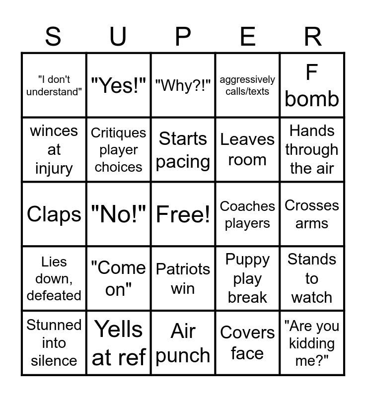 This bingo card has a free space and 24 words: "Come on", Yells at ref, Starts pacing, Stunned into silence, F bomb, "I don't understand", winces at injury, "Yes!", Coaches players, Patriots win, Leaves room, Claps, Puppy play break, Stands to watch, Critiques player choices, Covers face, Crosses arms, "Why?!", Hands through the air, "No!", "Are you kidding me?", Lies down, defeated, aggressively calls/texts and Air punch.