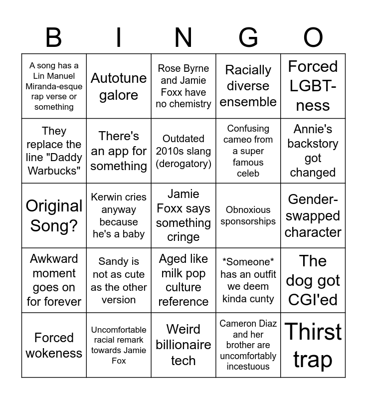 This bingo card has a free space and 24 words: Sandy is not as cute as the other version, Uncomfortable racial remark towards Jamie Fox, Outdated 2010s slang (derogatory), Forced wokeness, Forced LGBT-ness, A song has a Lin Manuel Miranda-esque rap verse or something, They replace the line "Daddy Warbucks", Autotune galore, Obnoxious sponsorships, Aged like milk pop culture reference, Confusing cameo from a super famous celeb, Original Song?, *Someone* has an outfit we deem kinda cunty, The dog got CGI'ed, There's an app for something, Cameron Diaz and her brother are uncomfortably incestuous, Gender-swapped character, Rose Byrne and Jamie Foxx have no chemistry, Annie's backstory got changed, Kerwin cries anyway because he's a baby, Thirst trap, Awkward moment goes on for forever, Racially diverse ensemble and Weird billionaire tech.