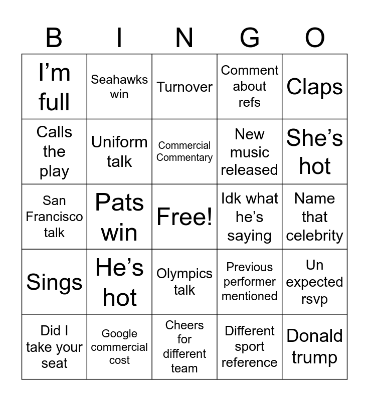 This bingo card has a free space and 24 words: He’s hot, Google commercial cost, Commercial Commentary, Did I take your seat, Claps, I’m full, Calls the play, Seahawks win, Idk what he’s saying, Olympics talk, New music released, San Francisco talk, Previous performer mentioned, Un expected rsvp, Uniform talk, Different sport reference, Name that celebrity, Turnover, She’s hot, Pats win, Donald trump, Sings, Comment about refs and Cheers for different team.