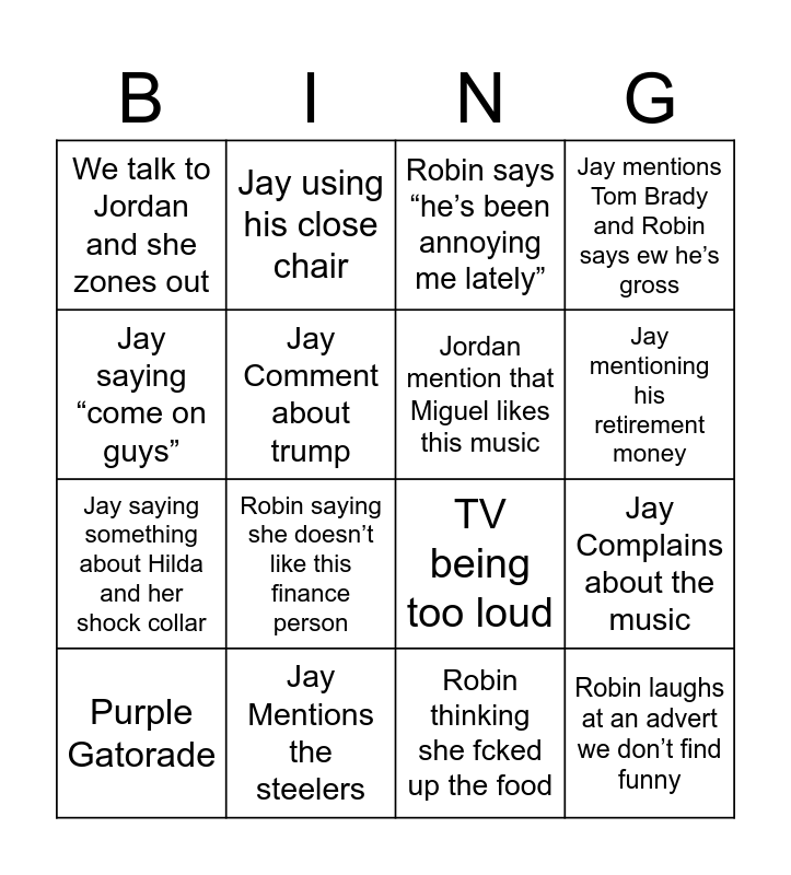 This bingo card has 16 words: Jay Mentions the steelers, Jay Complains about the music, Robin says “he’s been annoying me lately”, We talk to Jordan and she zones out, Jay saying something about Hilda and her shock collar, Jay using his close chair, TV being too loud, Robin thinking she fcked up the food, Jay saying “come on guys”, Jay Comment about trump, Purple Gatorade, Jay mentions Tom Brady and Robin says ew he’s gross, Robin saying she doesn’t like this finance person, Jay mentioning his retirement money, Jordan mention that Miguel likes this music and Robin laughs at an advert we don’t find funny.