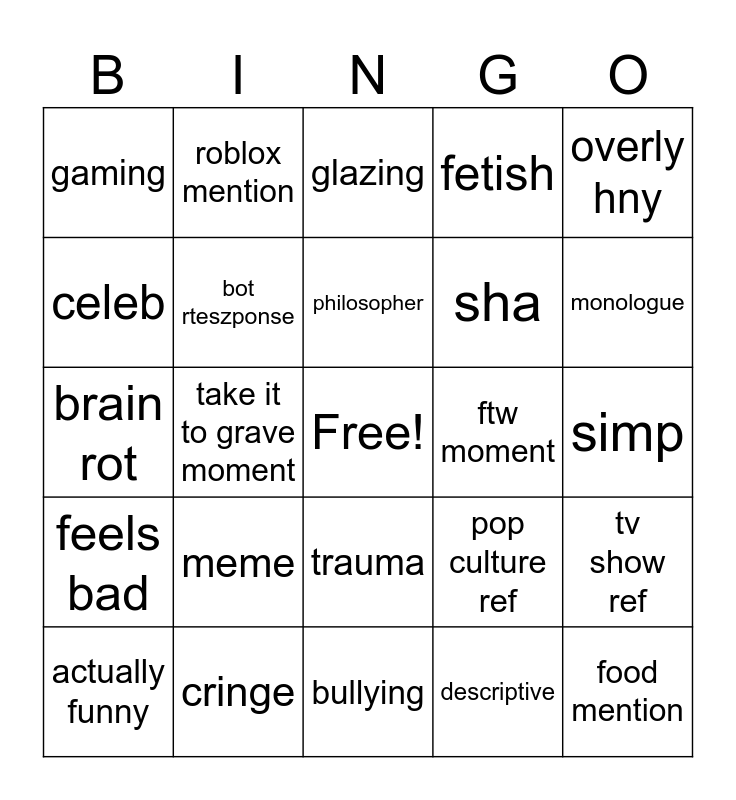 This bingo card has a free space and 24 words: meme, cringe, philosopher, actually funny, overly hny, gaming, celeb, roblox mention, ftw moment, trauma, sha, brain rot, pop culture ref, tv show ref, bot rteszponse, descriptive, simp, glazing, monologue, take it to grave moment, food mention, feels bad, fetish and bullying.