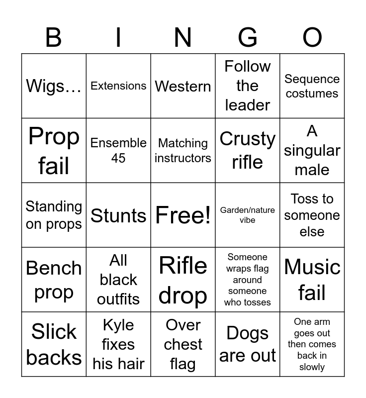 This bingo card has a free space and 34 words: Sad song with blue silks, Dogs are out, Man narrates song, A decades show, Bench prop, Ensemble 45, Sequence costumes, Slick backs, Extensions, TikTok songs, Matching instructors, Western, Partner work, Ripple toss, Garden/nature vibe, A singular male, Kyle fixes his hair, Standing on props, All black outfits, Someone wraps flag around someone who tosses, Rifle drop, Something gold, Wigs…, Toss to someone else, Over chest flag, One arm goes out then comes back in slowly, Follow the leader, Headband, Crusty rifle, Prop fail, Someone falls, Stunts, Music fail and Someone is being lifted.