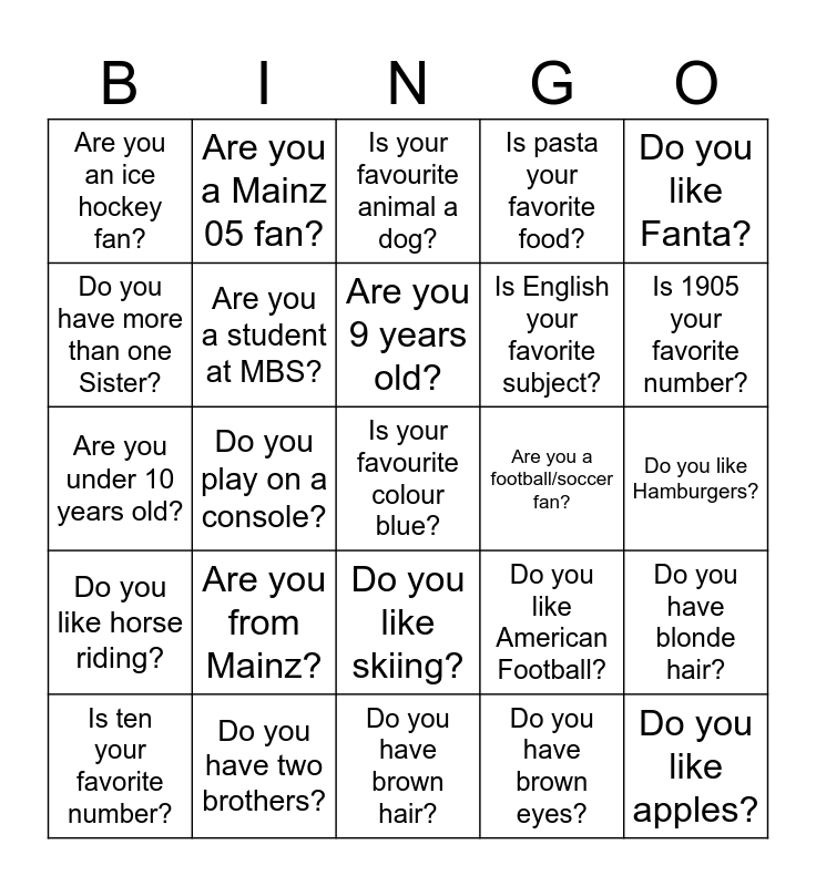 This bingo card has a free space and 24 words: Are you from Mainz?, Do you have two brothers?, Are you 9 years old?, Is ten your favorite number?, Do you like Fanta?, Are you an ice hockey fan?, Do you have more than one Sister?, Are you a Mainz 05 fan?, Are you a football/soccer fan?, Do you like skiing?, Is English your favorite subject?, Are you under 10 years old?, Do you like American Football?, Do you have blonde hair?, Are you a student at MBS?, Do you have brown eyes?, Do you like Hamburgers?, Is your favourite animal a dog?, Is 1905 your favorite number?, Do you play on a console?, Do you like apples?, Do you like horse riding?, Is pasta your favorite food? and Do you have brown hair?.